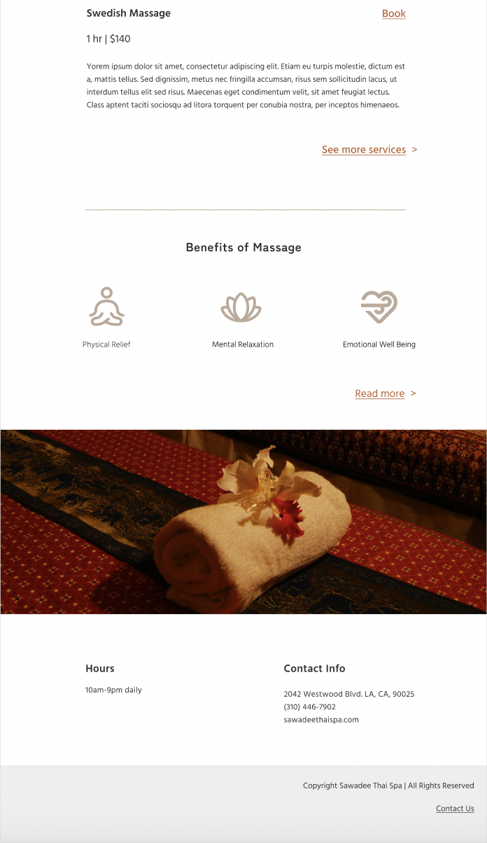 Target audience: Clients interested in viewing massages offered at Sawadee Thai Spa and arranging a time to come in.