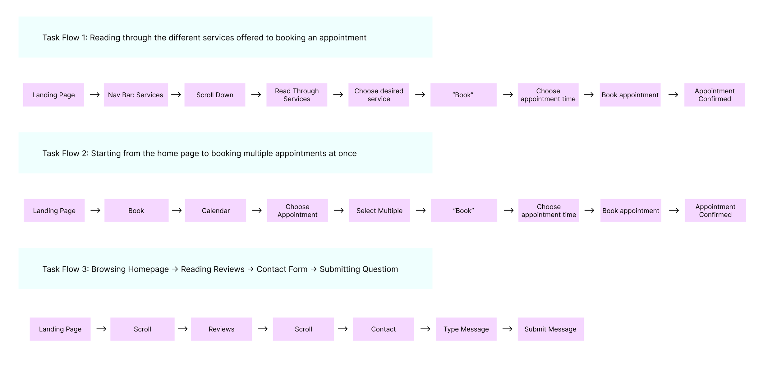 Task 1: Went through first task with ease. Started at the home page and scrolled down to services where she found the “book” button for Swedish Massage. Went through each page quickly. Noted it might be better to add a screen where one inserts their name and email, as there is nowhere to keep track of who is making the appointment.